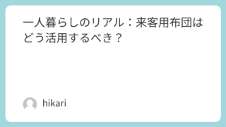 生活 一人暮らしのリアル:来客用布団はどう活用するべき? 一人暮らしをしていると、来客の予定があるたびに頭を悩ませるのが「来客用布団」の存在です。持っておくべきか、使う頻度はどのくらいか、収納場所は確保できるのかなど、考えることは意外と多いもの。とくに限られたスペースで生活している方にとって、来客... 生活